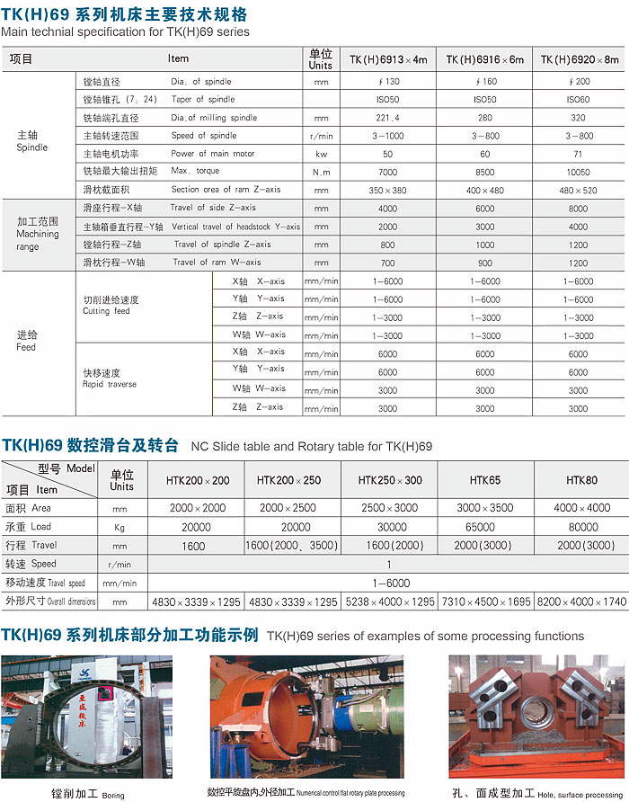 TK (H) 69 series CNC floor boring and milling machine, machining center ● The overall structure of the machine The series of machine tools using square ram type side hanging spindle box, single moving column, bed and platform split floor layout. The boring shaft is housed in the milling shaft and is supported in the square ram with the milling shaft. The column moves horizontally along the bed rail to form the x-axis feed movement. The spindle box moves vertically along the column guide to form the Y-axis feed movement. The boring axis moves longitudinally along the milling axis to form the z-axis feed movement. The square ram is closed along the spindle box The rectangular guide moves longitudinally to form the w-axis feed movement. ● Process assurance Machine basic parts from the bed, slide, column, spindle box and other components, material for the HT250 3 ∞ high quality alloy wearable cast iron. The vibration aging of a hot furnace aging a vibration aging a roughing a vibration aging half of a finishing furnace a time of vibration aging finishing a work to eliminate the workpiece stress to ensure long-term operation accuracy of the machine. ● Headstock The use of digital electro-hydraulic proportional valve and electromagnetic valve control, to achieve three precision compensation to ensure that the machine tool spindle high-precision requirements: (1) single hammer flexible coupling spindle box, to achieve the spindle box center of gravity balance compensation. (2) side of the ramps of the two hydraulic cylinders, to achieve square rams deformation compensation: (3) Annex weight compensation. ● Transfer Method X-axis feed for double helical gear meshing with high precision helical gear drive. X-axis <6m with high-precision pre-pressureless ball screw nut pair. Y, Z, W-axis feed mechanism for high-precision pre-pressure without gap ball screw nut (Y axis for the nut rotation). X, Y, w axis for the closed-loop control, z-axis semi-closed-loop control. ● Bearer way X, Y, W axis guide for the multi-point closed hydrostatic guide, the friction coefficient is small. Adjustable spiral capillary static pressure throttling damping structure, easy to adjust. ● Clamping method X, Y, W axis feed mechanism for the floating clamping device, the spindle tool clamping for the disc spring group clamping, hydraulic release, safe and reliable. ● Numerical control system According to user needs, select Siemens, Fanuc, France, Mitsubishi and other CNC system. Can achieve seven-axis control, any four-axis linkage function. ● Machine tool spindle Spindle with three bearing high stiffness structure, the main support in the main, after the support, supplemented by high-precision spindle bearings. Make sure the spindle is high precision. ● Knife library Can be equipped with 40, 50, 80 knife library. To achieve vertical and vertical tool change. ● Annex Can be configured fixed table, CNC rotary table, right angle milling head, universal milling head, flat plate and other accessories, to improve the selectivity of processing technology. |